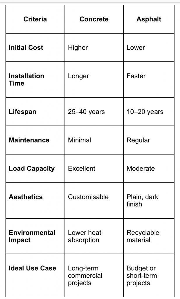 For developers managing long-term property investments, concrete offers better value. For projects with budget or time constraints, asphalt remains a reliable short-term choice.